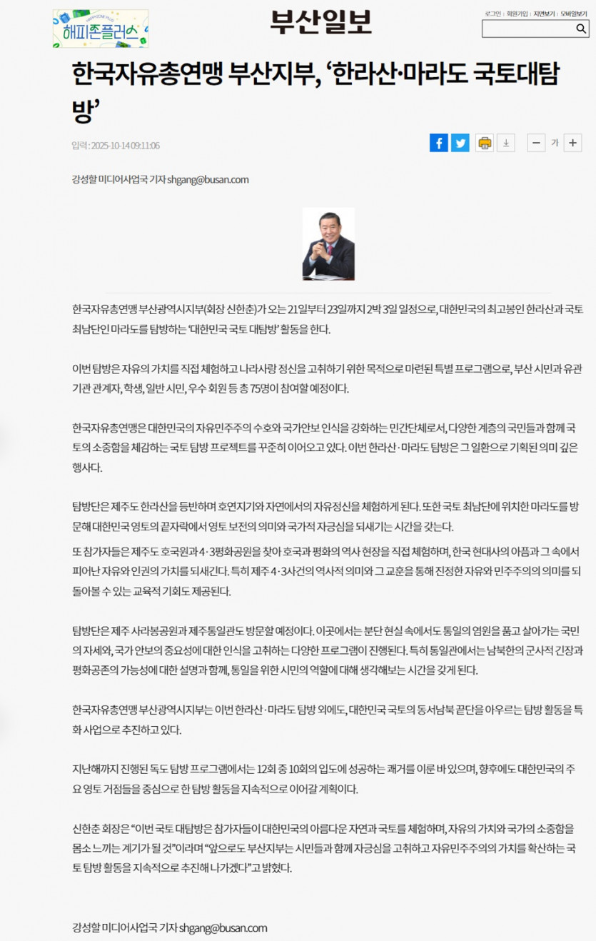 ▶[부산일보]부산지부 '한라산·마라도 국토대탐방' 기사 보도