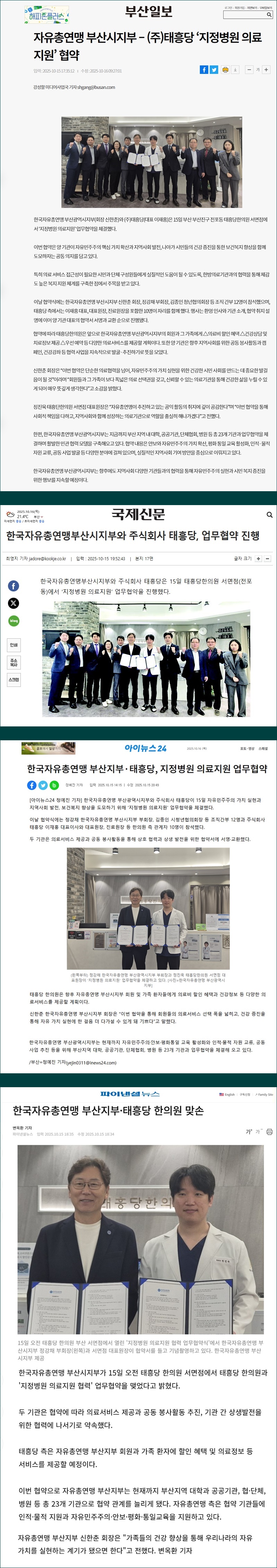 ▶부산광역시지부-태흥당한의원 업무협약식 개최 기사 보도 페이지 정보 작성자 관리자 작성일 25-10-16 09:58 본문 ▶부산광역시지부-태흥당한의원 업무협약식 개최 기사 보도모음 다음글▶[부산일보]부산지부 '한라산·마라도 국토대탐방' 기사 보도 25.10.14 리스트